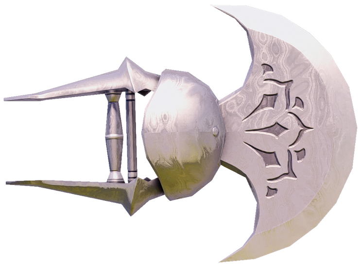 Background: With a chic and modern design, this weapon escapes traditional form with a stylish hardsilver form and black and blass chemical treating. To counteract the lack of a back weight, this axe has a visible thickness to it.