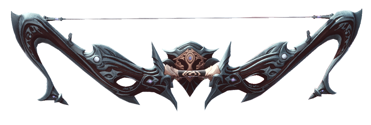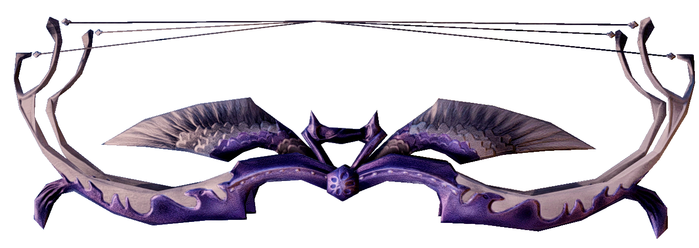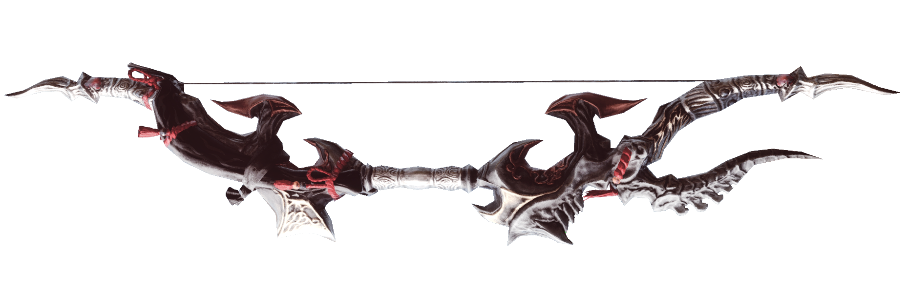 Background: The bow of a merciless assassin. Decorative and functional, the double stringed bow can throw arrows with twice the strength and speed of a typical bow. One must be careful not to snap the string though. Made of silver and mythril.